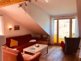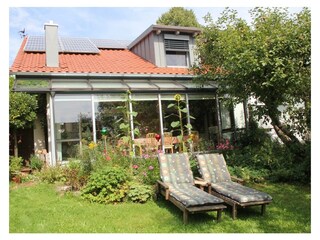 Comfortable apartment for 6 persons, certified with four stars, friendly, 90m ², shared garden, quiet area, living room with fireplace, balcony, 3 bedrooms with 6 beds, extra bed possible, bath, dining room, sauna.